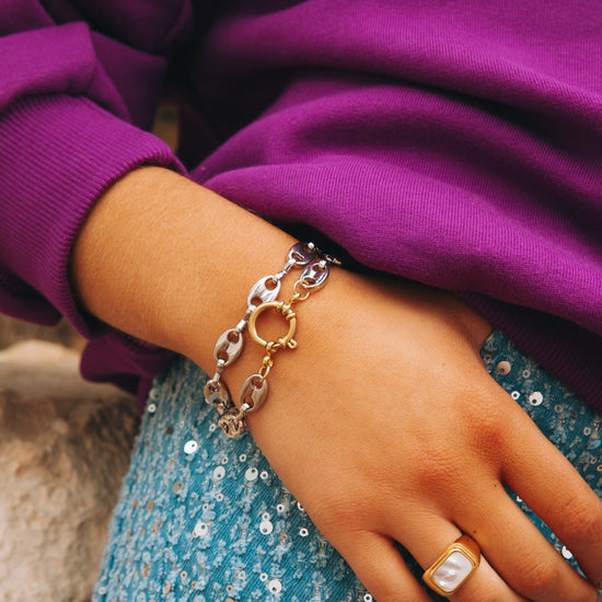 Ontdek onze Bonnie Bean armband. Gemaakt van elegante kralen in de vorm van een boon. Gemaakt met sluitingen van 18K verguld roestvrij staal, goud en zilver, het is zowel tijdloos als waterdicht.