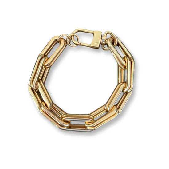Een van onze opvallende statement-ontwerpen. Deze armband heeft een robuuste, goudkleurige uitstraling en een aanzienlijk gewicht, wat hem een krachtige en luxueuze look geeft.