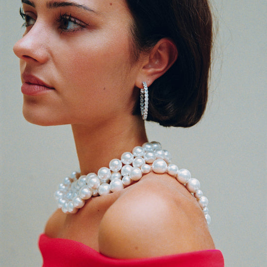 Klassieke oorringen, opnieuw vormgegeven met een sprankelende strass-steen rondom. Lichtgewicht, glanzend en eindeloos draagbaar – de ultieme feestelijke must-have.