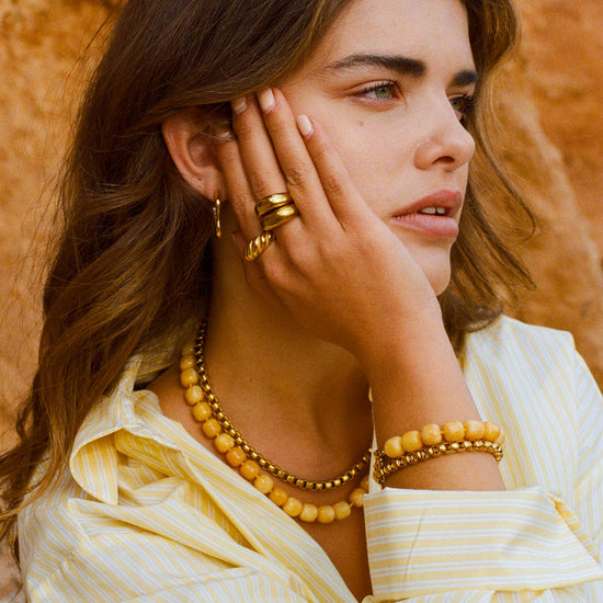 Om ervoor te zorgen dat uw 14-karaats vergulde Bonnie-sieraad zo lang mogelijk prachtig blijft glanzen, raden wij aan er extra voorzichtig mee om te gaan. Vermijd contact met water, parfum, lotions, zweet en hitte, aangezien deze de verguldlaag na verloop van tijd kunnen aantasten.