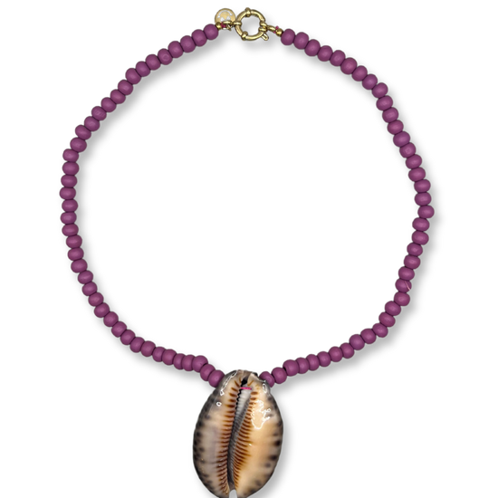 Deze ketting is ontworpen om een vleugje natuurlijke schoonheid aan je dagelijkse look toe te voegen. Met een prachtige hanger van tijgerschelp, gecombineerd met zachte lila tinten en wit, is het het perfecte accessoire voor een dromerige uitstraling. ~ Lengte: 40 cm ~ Sluiting: 12 mm | Roestvrij staal, 18 karaats verguld De kleuren stralen sereniteit ~ zelfvertrouwen ~ elegantie uit.